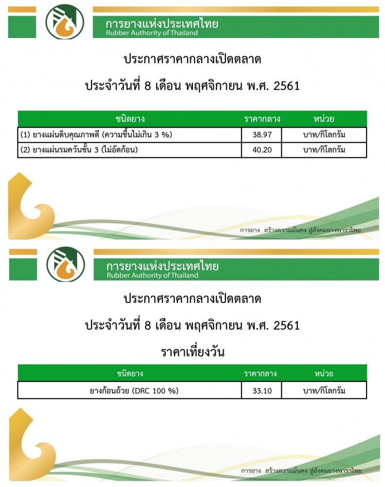 ราคากลางยางพาราเปิดตลาดวันนี้(8 พ.ย.61)