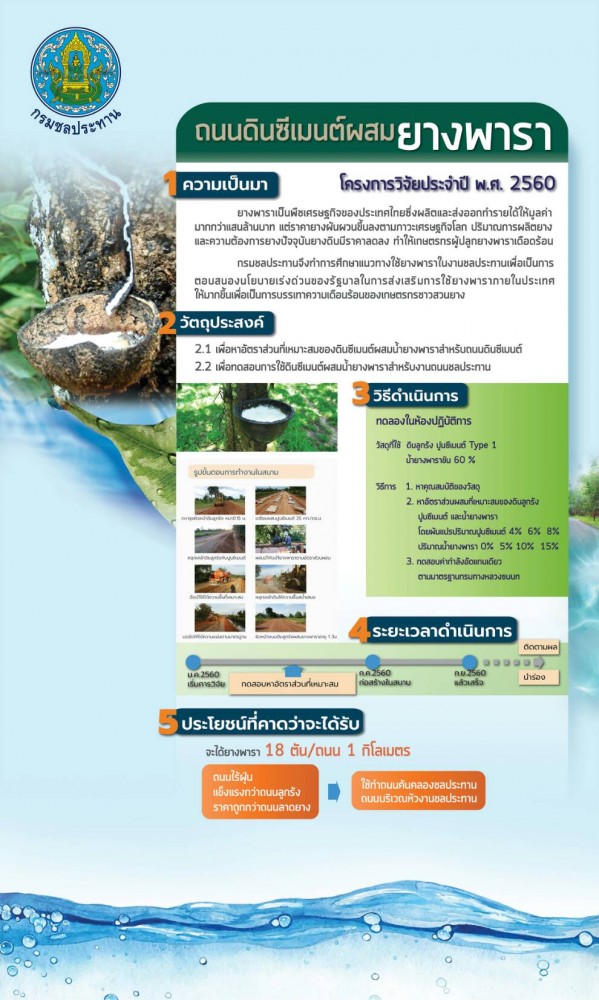 กรมชลประทานเตรียมงบฯปี 62 ทำแผนการนำยางพารามาใช้ในการดำเนินงาน 569 รายการ สร้างถนนระยะทางกว่า 2,000 กม. ใช้ยางพาราถึง 30,521.42 ตัน ตามโครงการส่งเสริมการใช้ยางในหน่วยงานภาครัฐ หลังจากปีงบประมาณ 2561 ดำเนินการไปแล้ว 317 รายการ สร้างถนนยาว 999.656 กม.ใช้ยางพารา 3,509.50 ตัน ล่าสุด“ลักษณ์” นำทีมตรวจเยี่ยมโครงการมาแล้วที่นครพนม