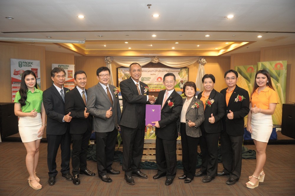 ดร.องอาจ กิตติคุณชัย(ที่ 5 จากขวา)ประธานเจ้าหน้าที่บริหาร พร้อมด้วยคณะผู้บริหารบริษัท ซันสวีท จำกัด (มหาชน) หรือSUN ผู้ผลิตและจำหน่ายข้าวโพดหวานแปรรูปภายใต้แบรนด์สินค้า KCเข้าร่วมลงนามบันทึกข้อตกลงกับนายพาโชค พงษ์พานิช (ที่ 6 จากขวา) กรรมการบริษัท และ นายยงค์ยุทธ ปานสูง (ที่ 7 จากขวา) กรรมการบริษัทแปซิฟิคเมล็ดพันธุ์ จำกัดในโครงการความร่วมมือพัฒนาสายพันธุ์ข้าวโพดหวานในระดับอุตสาหกรรม เพื่อสร้างความมั่นคงทางด้านวัตถุดิบ และ ยกระดับรายได้ของเกษตรกร ณ ห้องประชุมนนทรี 1 โรงแรม KU HOME มหาวิทยาลัยเกษตรศาตร์ บางเขน กรุงเทพฯ วันนี้( 16 พ.ย.61)