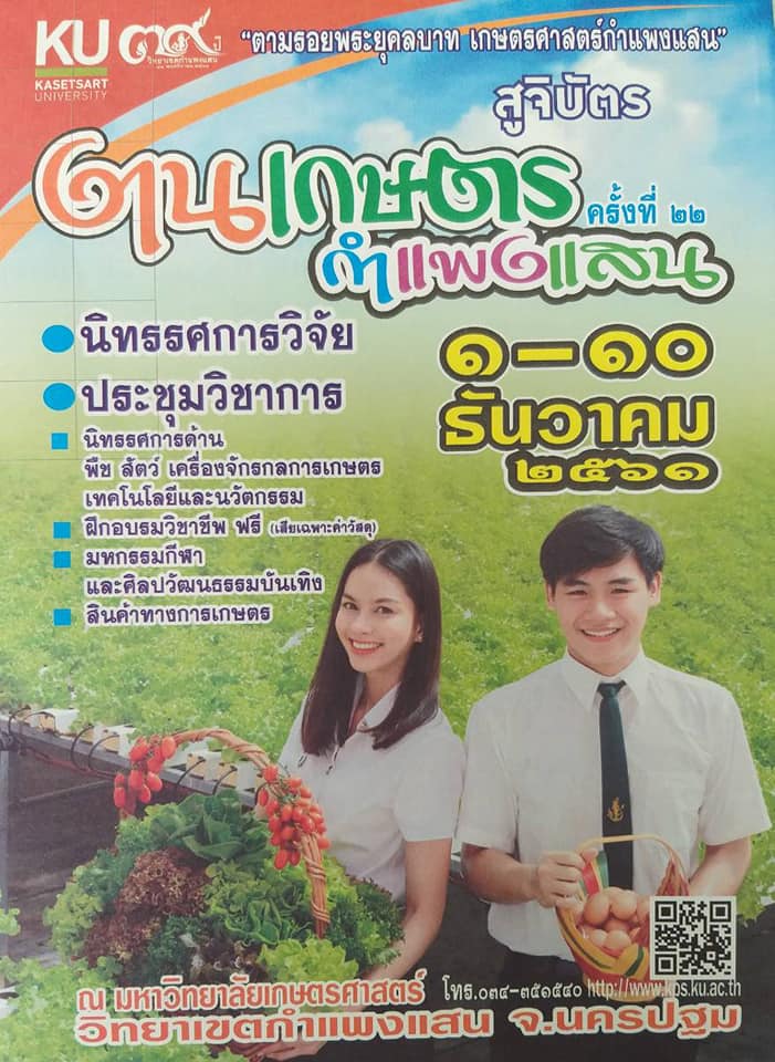 มหาวิทยาลัยเกษตรศาสตร์ วิทยาเขตกำแพงแสนเตรียมจัดงานเกษตรกำแพงแสน ครั้งที่ 22 “ตามรอยพระยุคลบาท เกษตรศาสตร์กำแพงแสน”ระหว่างวันที่ 1-10 ธันวาคม 2561 สุดยอดภายในงานภายในได้รวบรวมเทคโนโลยี ความก้าวหน้าทางด้านการเกษตรไว้ แบบครบวงจร