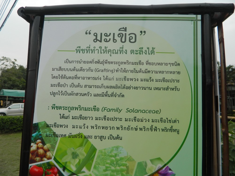 คมคาย สุพลจิตต์ นักศึกษาปีที่ 3 สาขาวิชาพืชผัก คณะเกษตร มหาวิทยาลัยแม่โจ้ ซึ่งเป็นเจ้าหน้าที่ที่คอบอธิบายเวลาผู้ที่เข้าชมงานของสาขาพืชผัก บอกว่า การปลูกมะเขือ 1 ต้น ได้กินมะเขือ 4 ชนิด หรือ 4 สายพันธุ์ มาเสียบกิ่งยอด ทำง่ายมาก