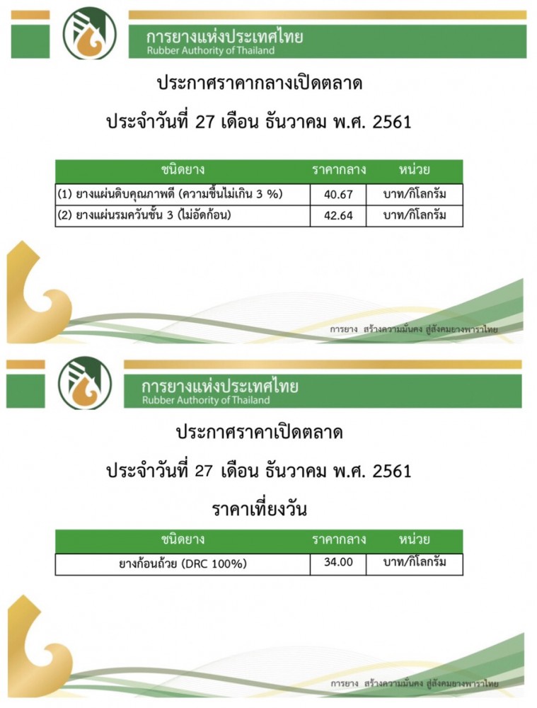 ราคากลางยางพาราเปิดตวันนี้ (27 ธ.ค.61) ธันวาคม 27, 2018ดลมนัส กาเจราคายางพารา, สถานีข่าววันนี้ราคากลางยางพารา, ราคายางพารา ที่มา : การยางแห่งประเทศไทย