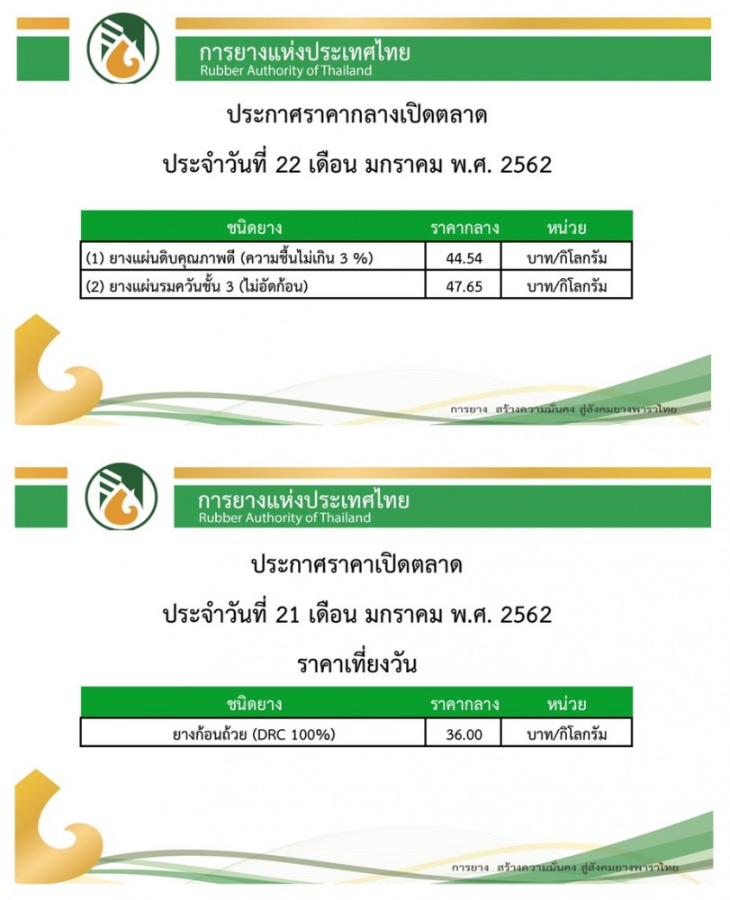 ราคากลางยางพาราเปิดตลาดวันนี้ (22 ม.ค. 62)ยางก้นถ้วยดีดขึ้น 1 บาท มกราคม 22, 2019ดลมนัส กาเจราคายางพารา, สถานีข่าววันนี้ราคากลางยางพารา, ราคายางพารา ที่มา : การยางแห่งประเทศไทย