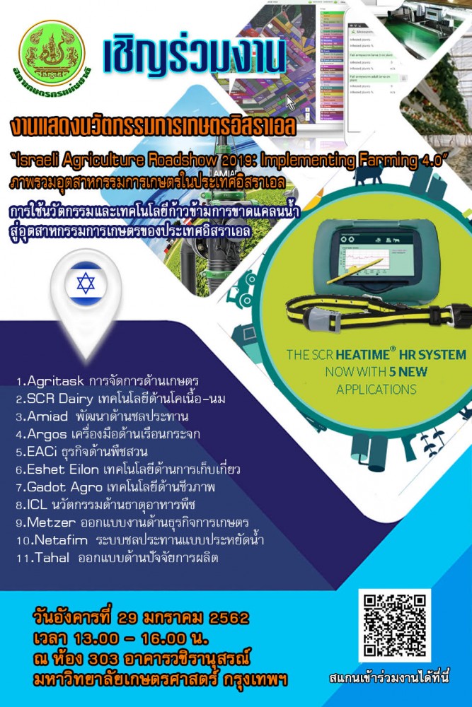 สิ่งเหล่านี้จึงนำมาสู่การจัดงานแสดงนวัตกรรมการเกษตรอิสราเอล “Israeli Agriculture Roadshow 2019: Implementing Farming 4.0” ในวันอังคารที่ 29 มกราคม 2562 เวลา 13.00 – 16.00 น. ณ ห้อง 303 อาคารวชิรานุสรณ์ มหาวิทยาลัยเกษตรศาสตร์ บางเขน กรุงเทพฯ เพื่อการนำความรู้ ประสบการณ์ในภาคธุรกิจและอุตสาหกรรมการเกษตรต่างๆมาพบกับเกษตรกรไทย
