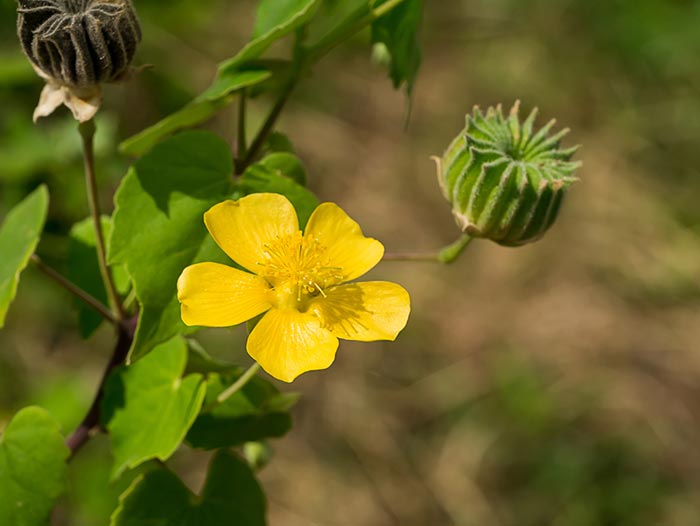 ต้นครอบจักรวาลเป็นพรรณไม้พุ่ม ลำต้นสูงราว 1.5 ฟุต ใบ เดี่ยวทรงกลม เส้นผ่าศูนย์กลางราว 6- 7 ซม.ใบจะมีขนสีขาวเล็ก ๆ ใบค่อนข้างหนา ส่วนดอกเป็นช่อสีเหลือง ขนาดราว2-3 ซม. ผล รูปทรงกลมตูมเป็นกลีบ ๆ คล้ายฟันที่ใช้สีข้าว