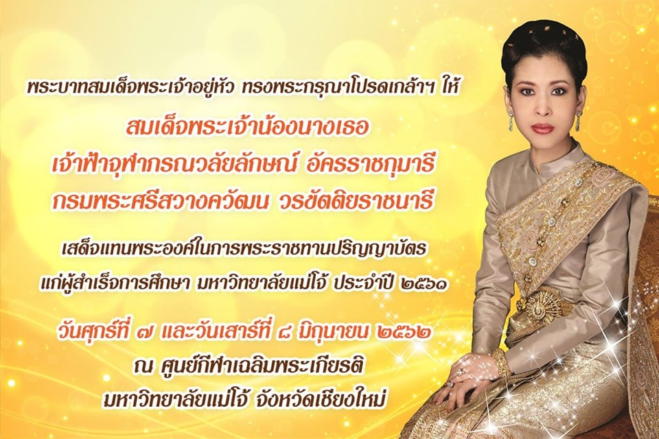 สมเด็จพระเจ้าอยู่หัวทรงพระกรุณาโปรดเกล้าฯ ให้สมเด็จพระเจ้าน้องนางเธอ เจ้าฟ้าจุฬาภรณวลัยลักษณ์ อัครราชกุมารี กรมพระศรีสวางควัฒนวรขัตติยราชนารี เสด็จแทนพระองค์ในการพระราชทานปริญญาบัตรแก่ผู้สำเร็จการศึกษามหาวิทยาลัยแม่โจ้ครั้งที่ 41 ประจำปีการศึกษา ๒๕60-๒๕61ณ มหาวิทยาลัยแม่โจ้ อำเภอสันทราย จังหวัดเชียงใหม่ ในวันศุกร์ที่ 7 และวันเสาร์ที่ 8 มิถุนายน๒๕๖2 ซึ่งในปีนี้มีบัณฑิต มหาบัณฑิต และดุษฎีบัณฑิต เข้ารับพระราชทานปริญญาบัตร จำนวน ๓,๘๔๑ ราย แยกเป็น ระดับบัณฑิตศึกษา (ป.โท-ป.เอก) จำนวน 13๘ราย และระดับบัณฑิต (ป.ตรี) จำนวน 3,703 ราย