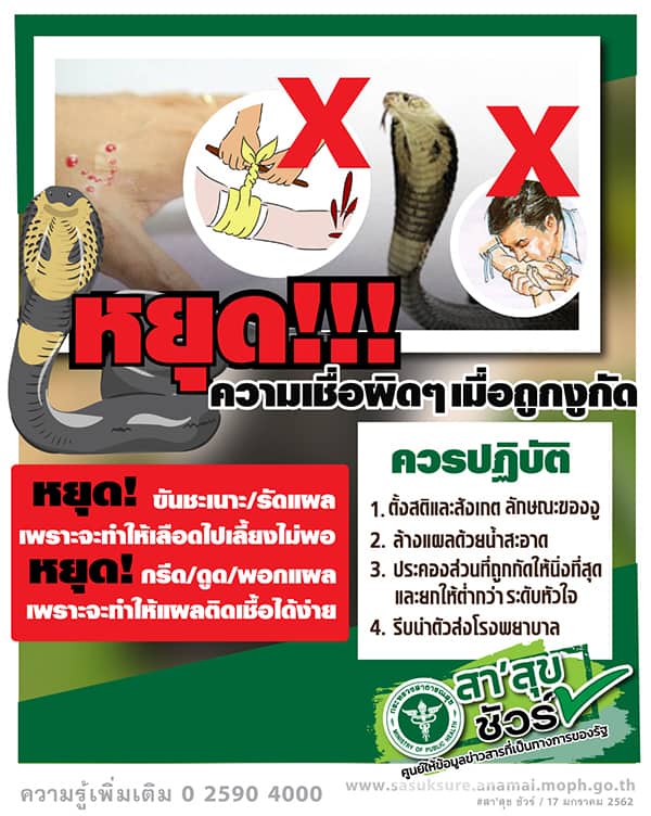 ที่สำคัญอีกอย่างหนึ่งครับ คือความเชื่อแบบบ้าน คือเวลาถูกงูกัด จะมีการกรีดแผล หรือดูดพิษ และมักพอกยาเอง ตรงนี้ทางกระทรวงสาธารณสุข ออกมาเตือนเช่นกันครับว่า หากถูกงูกัดห้ามกรีดแผล ดูดพิษจากแผล หรือพอกยา เพราะอาจทำให้แผลติดเชื้อ สิ่งที่ควรทำหากโดนงูกัดให้รีบไปพบแพทย์ที่โรงพยาบาลที่ใกล้ที่สุดครับ