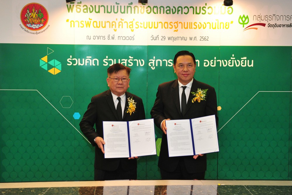 นายวิวัฒน์ ตังหงส์ อธิบดีกรมสวัสดิการและคุ้มครองแรงงาน กล่าวว่า ทางกรมสวัสดิการและคุ้มครองแรงงาน กระทรวงแรงงาน ได้ลงนามบันทึกข้อตกลงความร่วมมือ (Memorandum of Understanding : MoU) กับ บริษัท กรุงเทพโปรดิ๊วส จำกัด (มหาชน) ซึ่งเป็นผู้จัดหาวัตถุดิบให้กับ บริษัท เจริญโภคภัณฑ์อาหาร จำกัด (มหาชน) หรือ ซีพีเอฟ ภายใต้ “โครงการความร่วมมือพัฒนาคู่ค้าสู่ระบบมาตรฐานแรงงานไทย” โดยโครงการดังกล่าว กรมฯจะเป็นผู้จัดการฝึกอบรมและสัมมนาเชิงปฏิบัติการแก่คู่ค้าธุรกิจในห่วงโซ่อุปทานของซีพีเอฟ เพื่อให้คู่ค้าธุรกิจมีความรู้ความเข้าใจเกี่ยวกับการบริหารจัดการแรงงานอย่างถูกต้อง ตั้งแต่กระบวนการสรรหาว่าจ้าง ชั่วโมงการทำงาน สวัสดิการและสิทธิประโยชน์ของแรงงาน ขจัดปัญหาแรงงานเด็ก การต่อต้านการบังคับใช้แรงงานรวมถึงการค้ามนุษย์ การส่งเสริมความเท่าเทียมกันในสถานประกอบการ ตลอดจนการสนับสนุนให้สถานประกอบการมีสภาพแวดล้อมในการทำงานที่ปลอดภัย สอดคล้องกับระบบมาตรฐานแรงงานไทย (มรท.)