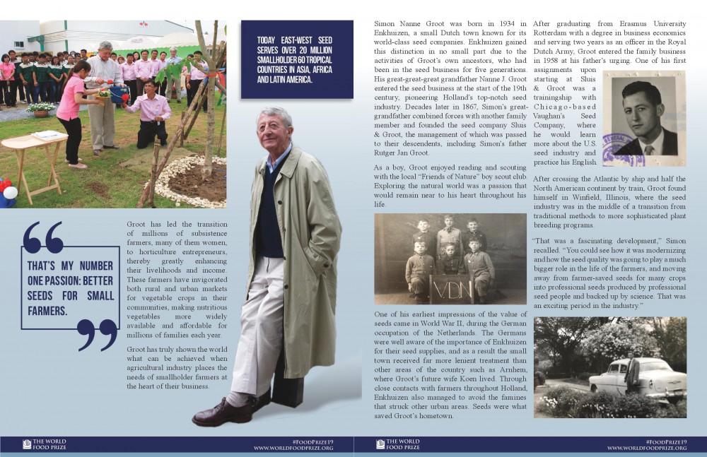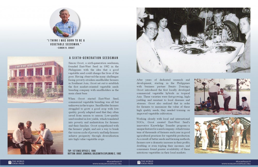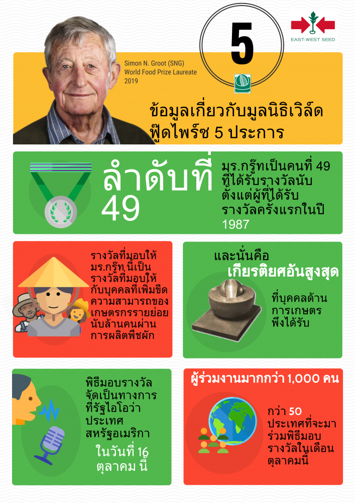 รางวัลมูลนิธิเวิลด์ฟู้ดไพรซ์ หรือที่รู้จักในชื่อ “รางวัลโนเบลในวงการอาหารโลก” ได้ยกย่องถึงความทุ่มเทตลอดระยะเวลาเกือบ 4 ทศวรรษของ มร.กรู๊ทและบริษัท อีสท์ เวสท์ ซีด ในการพัฒนาอุตสาหกรรมเมล็ดพันธุ์พืชผักเขตร้อนโดยมีเกษตรกรรายย่อยเป็นศูนย์กลาง เริ่มจากภูมิภาคเอเชียตะวันออกเฉียงใต้และขยายต่อเนื่องไปทั่วภูมิภาคเอเชีย แอฟริกาและละตินอเมริกา ผลงานของมร.กรู๊ท ได้แก่การฟื้นฟูและสร้างความยั่งยืนในตลาดพืชผักทั้งในชนบทและในเมือง ทำให้ผู้ผู้บริโภคกว่าหลายล้านครัวเรือนสามารถเข้าถึงผักที่มีคุณค่าทางโภชนาการและมีราคาที่เหมาะสมได้มากขึ้น