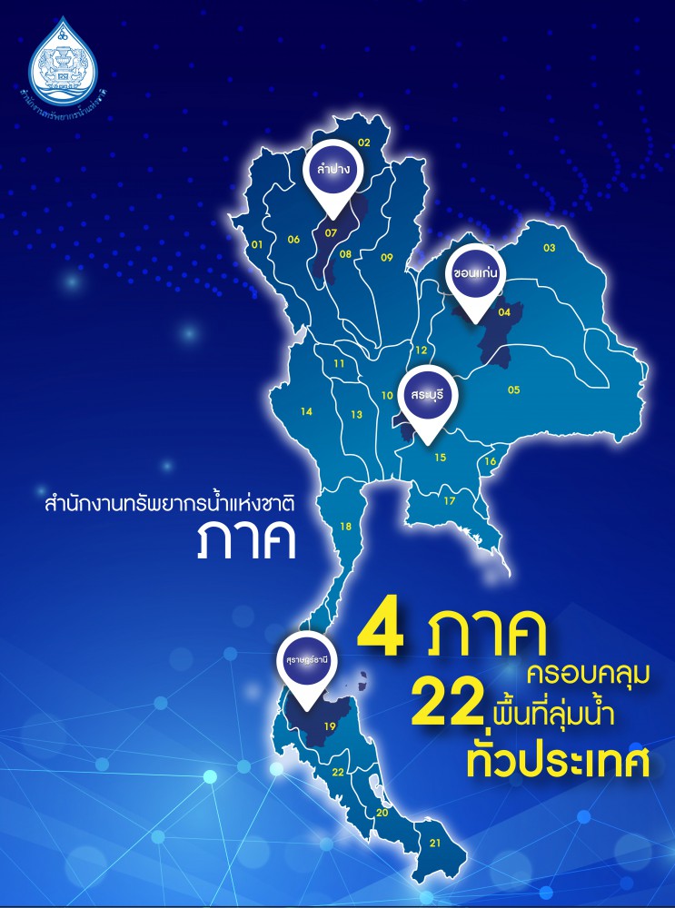 นายสมเกียรติ ประจำวงษ์ เลขาธิการสำนักงานทรัยพากรน้ำแห่งชาติ (สทนช.) เปิดเผยว่า การประชุมคณะรัฐมนตรีเมื่อวันที่25 มิถุนายน 2562 มีมติเห็นชอบร่างกฏกระทรวงแบ่งส่วนราชการสำนักงานทรัพยากรน้ำแห่งชาติ สำนักนายกรัฐมนตรี พ.ศ……. ซึ่งมีสาระสำคัญ คือ การตั้งสำนักงานทรัพยากรน้ำแห่งชาติภาคใน 4 ภูมิภาค ครอบคลุม 22 ลุ่มน้ำใหม่ แบ่งเป็น 1.ภาคเหนือ จ. ลำปาง 2.ภาคตะวันออกเฉียงเหนือ จ.ขอนแก่น 3. ภาคกลาง จ.สระบุรี และ 4.ภาคใต้ จ.สงขลา
