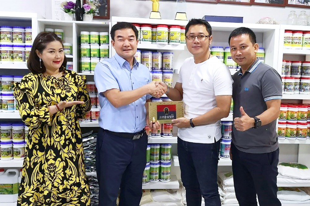 นายมนตรี บุญจรัส (ที่ 2 จากขวา) ประธานกรรมการชมรมเกษตรปลอดสารพิษ ภายใต้บริษัทไทยกรีน อะโกร จำกัด ให้การต้อนรับ MR. CHO CAUNG-HUN ประธานบริษัท HANA BIOTECH CO., LTD จากประเทศเกาหลี และ MR. LE THANH HAI ประธานบริษัท ADI AGRICUTURE DEVELOPMENT AND TRADING INVESTMENT JOINT STOCK COMPANY จากประเทศเวียดนาม
