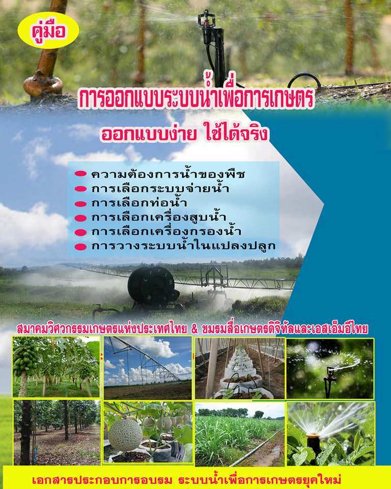 ใกล้เข้ามาแล้วครับ จัดอบรม “ระบบน้ำเพื่อการเกษตรยุคใหม่… ออกแบบง่าย ใช้ได้จริง…” จัดโดยสมาคมวิศวกรรมเกษตรแห่งประเทศไทย ร่วมกับ ชมรมสื่อเกษตรดิจิทัลและเอสเอ็มอีไทย ในลักษณะ ม้วนเดียวภายใน 1 วันจบ สามารถนำไปใช้จริงได้เลย งานนี้จัดขึ้นในวันอาทิตย์ที่ 21 กรกฎาคม 2562 ณ มหาวิทยาลัยเกษตรศาสตร์ บางเขน กรุงเทพฯ