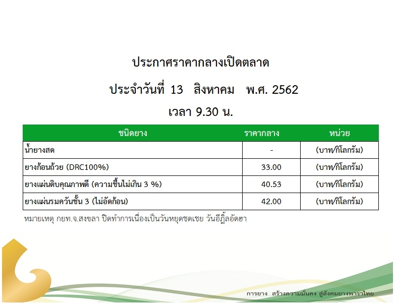 ราคากลางยางพาราเปิดตลาดวันนี้ (13 ส.ค.62)ยางแผ่นมาแตะเพดาน กก.ละกว่า 40 บาทอีกครั้ง สิงหาคม 13, 2019สิงหาคม 13, 2019ดลมนัส กาเจราคายางพารา, สถานีข่าววันนี้ราคายางพารา, ราคายางวันนี้, สถานการณ์ราคายาง ที่มา : การยางแห่งประเทศไทย