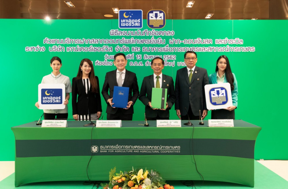 วันที่15 สิงหาคม 2562นายอภิรมย์ สุขประเสริฐ ผู้จัดการธนาคารเพื่อการเกษตรและสหกรณ์การเกษตร (ธ.ก.ส.) และนายวีรเดช อัครผลพานิช รองกรรมการผู้จัดการอาวุโส บริษัท เคาน์เตอร์เซอร์วิส จำกัด ร่วมลงนามในบันทึกข้อตกลงเพื่อการเป็นตัวแทนของ ธ.ก.ส. (Banking Agent) ณ สำนักงานใหญ่ ธ.ก.ส. บางเขน กรุงเทพฯ ว่าด้วยการให้บริการรับฝากสลากออมทรัพย์เกษตรยั่งยืน ฝาก-ถอนเงินสด และรับชำระค่าบริการต่าง ๆ ผ่านเคาน์เตอร์เซอร์วิสในร้าน 7-Eleven