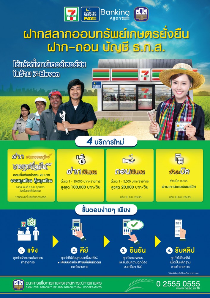 นายอภิรมย์ ธ.ก.ส. กล่าวว่า ธ.ก.ส.เล็งเห็นถึงความสำคัญในการเพิ่มช่องทาง การให้การบริการธุรกรรมทางการเงินที่หลากหลายแก่ลูกค้าจึงได้ร่วมกับบริษัท เคาน์เตอร์เซอร์วิส จำกัด ในการเป็นตัวแทนของธนาคาร หรือ Banking Agent เพื่อให้บริการทางการเงิน ประกอบด้วยการรับฝากสลากออมทรัพย์เกษตรยั่งยืน การฝาก-ถอนเงินสด และการรับชำระค่าบริการต่าง ๆ อาทิ การรับชำระหนี้ของ ธ.ก.ส. บางประเภท รับฝากเงินฝากเพื่อสงเคราะห์ชีวิต รับชำระค่าสมาคมฌาปนกิจ ลูกค้า ธ.ก.ส. เป็นต้น ซึ่งลูกค้าสามารถติดต่อใช้บริการได้ง่าย ๆ ที่เคาน์เตอร์เซอร์วิสในร้าน7-Eleven ใกล้บ้านท่าน กว่า 12,500 ร้านค้าทั่วประเทศ