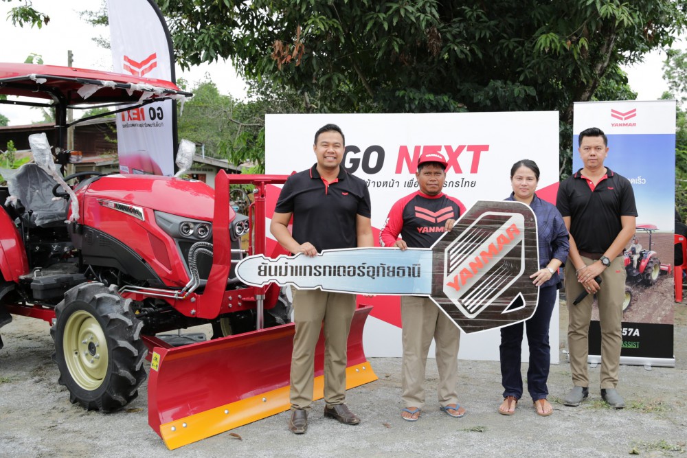 นายธัชพล ชวินธนโชติ (ซ้ายสุด) ผู้จัดการฝ่ายการตลาด บริษัท ยันม่าร์ เอส. พี. จำกัด พร้อมด้วยนางจรรยวรรธน์เอี่ยมพิบูลย์วัฒนา (ที่ 2 ขวา) ผู้บริหารยันม่าร์แทรกเตอร์อุทัยธานี ส่งมอบแทรกเตอร์ YM357A ใหม่ ให้แก่นายมาโนช หงษ์ไกร (ที่ 2 ซ้าย) เกษตรกรใน อ.ลานสัก จ.อุทัยธานี เมื่อเร็วๆ นี้
