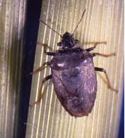 ส่วนเพลี้ยกระโดดสีน้ำตาล Nilaparvata lugens (Stal) เป็นแมลงปากดูด ตัวเต็มวัยมีลำตัวสีน้ำตาลถึงน้ำตาลปนดำ มีรูปร่าง 2 ลักษณะ คือ ชนิดปีกยาว และชนิดปีกสั้น ชนิดปีกยาวสามารถเคลื่อนย้ายและอพยพไปในระยะทางใกล้และไกล โดยอาศัยกระแสลมช่วย ตัวเต็มวัยเพศเมีย วางไข่เป็นกลุ่ม ส่วนใหญ่วางไข่ ที่กาบใบข้าว หรือเส้นกลางใบ บริเวณที่วางไข่จะมีรอยช้ำเป็นสีน้ำตาลไข่มีลักษณะรูปกระสวยโค้งคล้ายกล้วยหอม มีสีขาวขุ่น ตัวอ่อนมี 5 ระยะ ตัวเต็มวัยมีชีวิตประมาณ 2 สัปดาห์