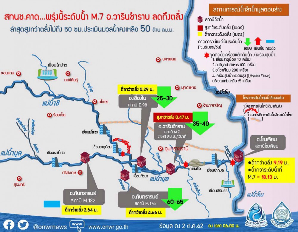 สทนช.ส่งสัญญาณข่าวดีชาวอ.วารินชำราบ เตรียมกลับเข้าบ้านได้แล้วในวันที่ 3 ตุลาคม 2562 หลังประเมินระดับน้ำสถานี M.7 ต่ำกว่าระดับตลิ่ง พร้อมส่งหนังสือด่วนถึง 5 หน่วยงานหลัก เตรียมรับภัยแล้งต่อ เล็งเสนอ ครม.ในวันที่ 8 ตุลาคมนี้ ทำแผนจัดสรรน้ำ-มาตรการป้องผลกระทบล่วงหน้า และเร่งสร้างความเข้าใจกับประชาชนในพื้นที่ โดยเฉพาะเกษตรกรให้รับรู้สถานการณ์ล่วงหน้าก่อนลงทุนเพาะปลูก