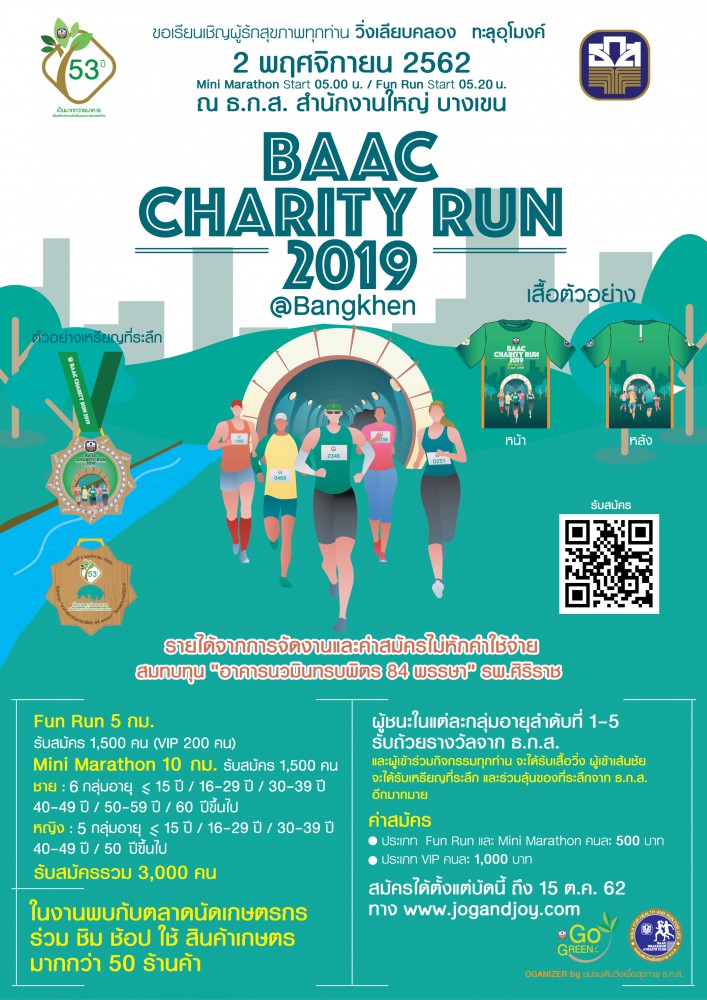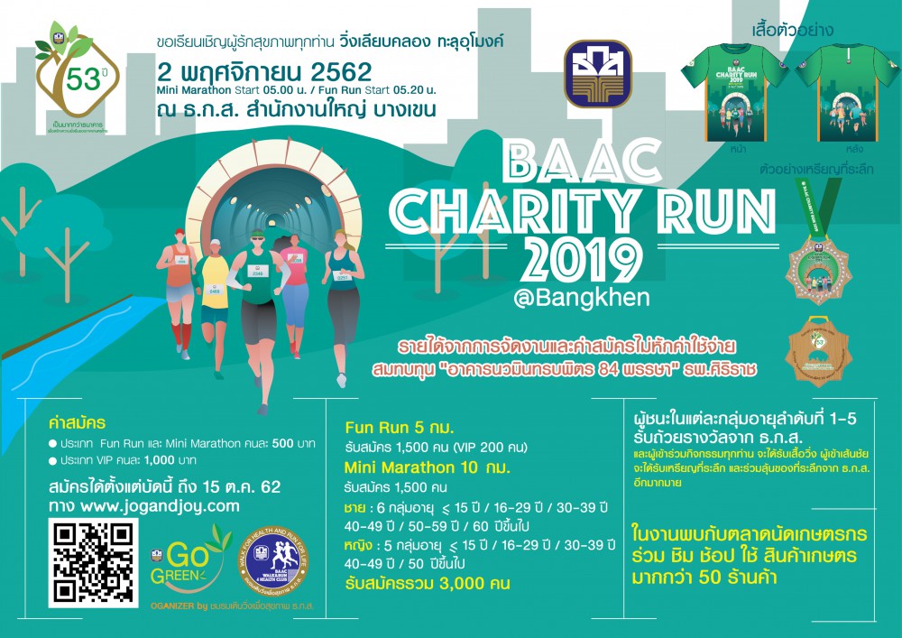ธ.ก.ส. จัดงาน “BAAC Charity Run 2019@Bangkhen” ยิ่งใหญ่วิ่งเลียบคลอง ทะลุอุโมงค์ เนื่องในโอกาสครบรอบ 53 ปี เพื่อนำรายได้ไม่หักค่าใช้จ่าย ร่วมสมทบทุนสร้าง “อาคารนวมินทรบพิตร 84 พรรษา” โรงพยาบาลศิริราช สมัครได้ตั้งแต่บัดนี้ถึง 15 ตุลาคม 2562 ทางเว็บไซต์www.jogandjoy.com พร้อมชวนชม ชิม ช็อป กับตลาดนัดของดีวิถีชุมชนทั่วไทย กว่า 60 บูธในวันที่ 2 พฤศจิกายน 2562 ณ ธ.ก.ส. สำนักงานใหญ่ บางเขน