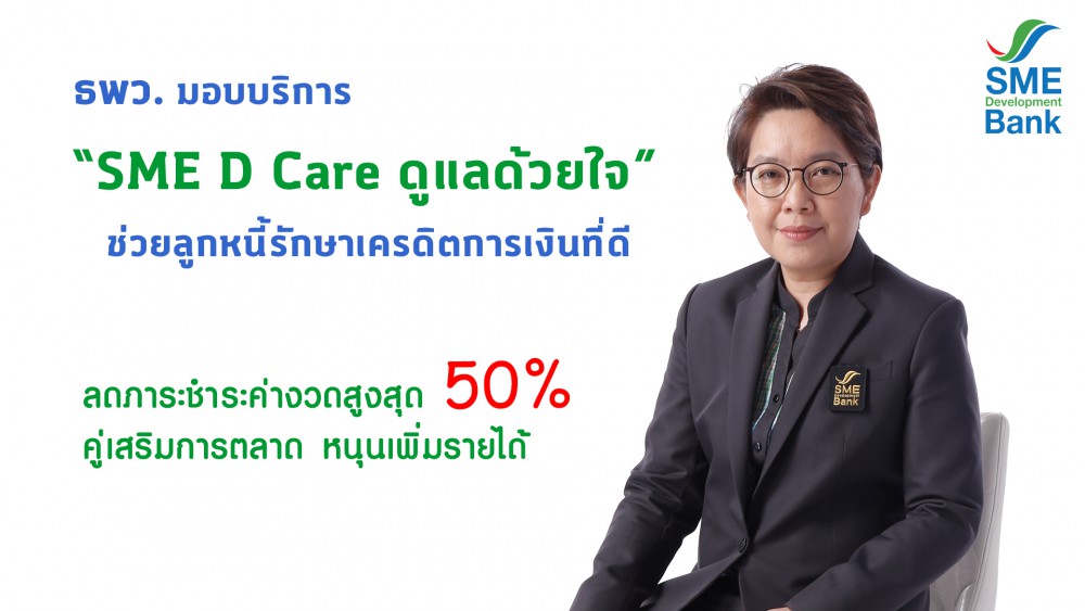 ธพว.ขานรับนโยบายแบงก์ชาติ เปิดบริการ “SME D Care ดูแลด้วยใจ” ผ่าน Call Center 1357 และ 95 สาขาทั่วประเทศ เฝ้าติดตามช่วยเหลือลูกหนี้ใกล้ชิด ตั้งแต่ธุรกิจเริ่มส่งสัญญาณติดขัด ดันมาตรการปรับโครงสร้างหนี้ผ่อนปรนการชำระค่างวดลงสูงสุด 50% หรือชำระเฉพาะดอกเบี้ย นาน 1 ปี ช่วยผู้ประกอบการลดภาระ มีเงินหมุนเวียนเพิ่ม รักษาเครดิตการเงินที่ดี ควบคู่เติมความรู้ เสริมการตลาด หนุนเพิ่มรายได้