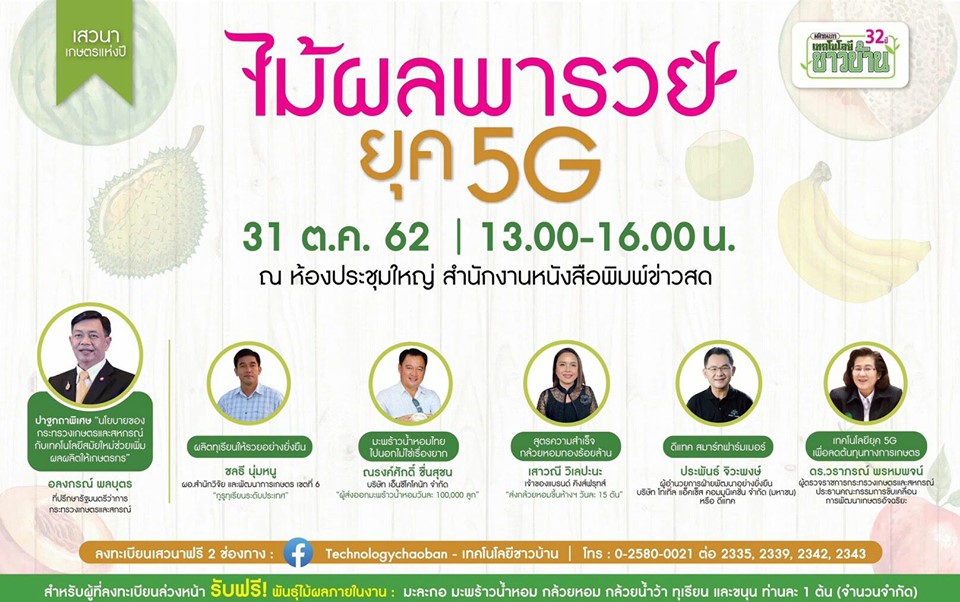 นิตยสารเทคโนโลยีชาวบ้านจัดเสวนา “ไม้ผลพารวยยุค 5G “ในโอกาสก้าวขึ้นสู่ปีที่ 32 วันที่ 31 ตุลาคม 2562 เวลา 13.00-16.00 น.ณ ห้องประชุมใหญ่ สำนักงานหนังสือพิมพ์ข่าวสด ในงานมีนายอลงกรณ์ พลบุตร ที่ปรึกษารัฐมนตรีว่าการกระทรวงเกษตรและสหกรณ์ ปาฐกถาพิเศษ “นโยบายของกระทรวงเกษตรและสหกรณ์กับเทคโนโลยีใหม่ช่วยเพิ่มผลผลิตให้เกษตรกร”