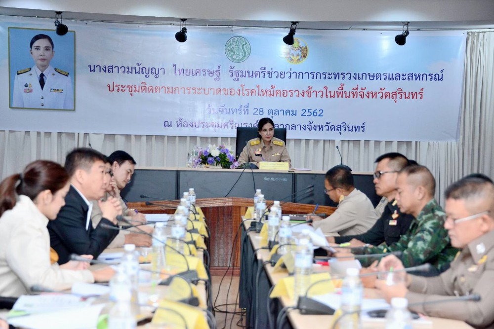 นางสาวมนัญญา ไทยเศรษฐ์ รัฐมนตรีช่วยว่าการกระทรวงเกษตรและสหกรณ์ เปิดเผยภายหลังการประชุมติดตามสถานการณ์การระบาดของโรคไหม้คอรวงข้าวในพื้นที่จังหวัดสุรินทร์ ณ ศาลากลางจังหวัดสุรินทร์ อ.เมือง จ.สุรินทร์ ว่า จากการรายงานสถานการณ์การระบาดศัตรูข้าวของกรมส่งเสริมการเกษตร เมื่อวันที่ 16 ตุลาคม 2562 ที่ผ่านมา พบการระบาดของโรคไหม้คอรวงข้าวใน 7 จังหวัด ได้แก่ ลําพูน แพร่ จันทบุรี มุกดาหาร มหาสารคาม สุรินทร์ และสงขลา รวม 7,442 ไร่ และพบการระบาดของเพลี้ยกระโดดสีน้ำตาลใน 6 จังหวัด ได้แก่ ลําปาง แพร่ อุตรดิตถ์ พิจิตร อ่างทอง และสุพรรณบุรี รวม 18,141 ไร่