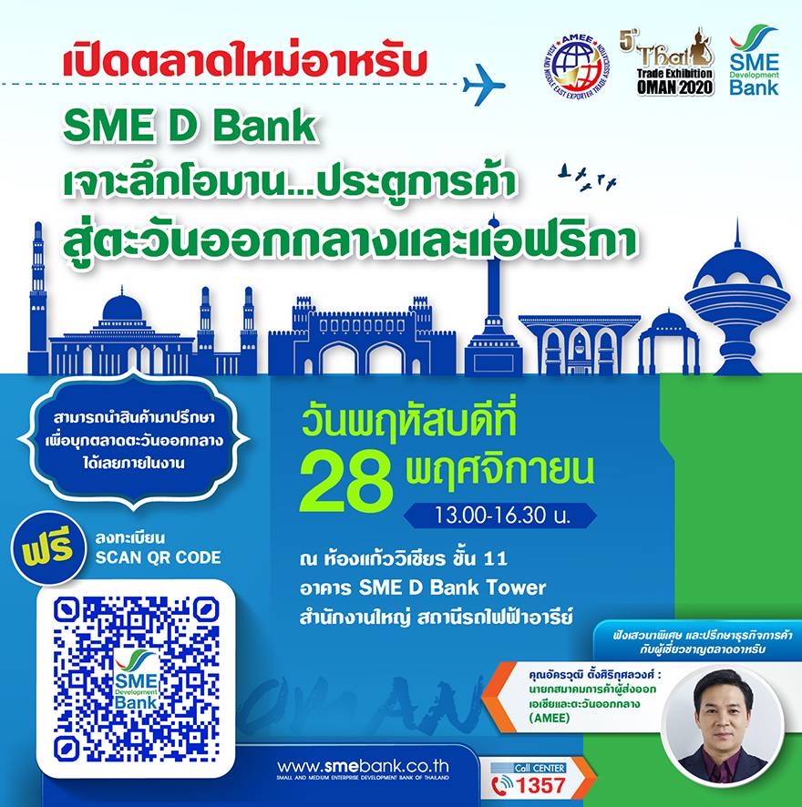 ธนาคารพัฒนาวิสาหกิจขนาดกลางและขนาดย่อมแห่งประเทศไทย (ธพว.) หรือ SME D Bank ร่วมกับ สมาคมการค้าผู้ส่งออกเอเชียและตะวันออกกลาง จัดงานเสวนา “เปิดตลาดใหม่อาหรับกับ SME D Bank เจาะลึกโอมาน..ประตูการค้า สู่ตะวันออกกลางและแอฟริกา” โดยมีวิทยากรผู้เชี่ยวชาญจากประสบการณ์ตรงในตลาดอาหรับ คุณอัครวุฒิ ตั้งศิริกุศลวงศ์ นายกสมาคมการค้าผู้ส่งออกเอเซียและตะวันออกกลาง (AMEE) พร้อมผู้บริหารธนาคารร่วมเสวนาพิเศษถึงบทบาทการสนับสนุนสินเชื่อ และการยกระดับผู้ประกอบการไทยให้สามารถเข้าถึง “แหล่งเงินทุนเพื่อธุรกิจ SME”