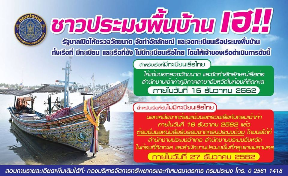 กรมประมงออกประกาศ ขอให้ชาวประมงพื้นบ้าน ที่มีเรือต่ำกว่า 10 ตันกรอส เร่งยื่นจดทะเบียนเรือไทย สำหรับเรือประมงพื้นบ้าน เพื่อทำการวัดขนาดและจัดทำอัตลักษณ์เรือ ภายในวันที่ 27 ธันวาคม 2562 นี้