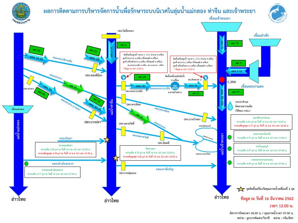 กรมชลฯสั่งเฝ้าระวังแม่น้ำสายหลัก หวันน้ำเค็มละลัก หลังพบที่ลุ่มน้ำแม่กลอง พื้นที่บริเวณอำเภอดำเนินสะดวก จังหวัดราชบุรี มีค่าความเค็มสูงสุด 0.77 กรัมต่อลิตร เมื่อวันที่ 15 ธันวาคม 2562 สถานการณ์น้ำลุ่มน้ำเจ้าพระยา ปริมาณน้ำที่มีอยู่เพียงพอต่อการอุปโภคบริโภค และการรักษาระบบนิเวศเท่านั้น