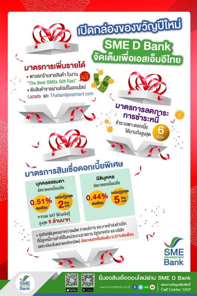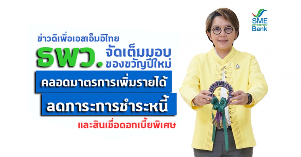 ธพว. มอบของขวัญปีใหม่เพื่อเอสเอ็มอีไทย คลอดมาตรการพิเศษ ช่วยเพิ่มรายได้ พาออกร้านในงาน “The Best SMEs Gift Fest”ฟรี ลดภาระการชำระหนี้ 6 เดือน พร้อมเติมทุนผ่านสินเชื่อดอกเบี้ยพิเศษ เริ่มต้นเพียง 0.33% ต่อเดือน ครอบคลุมทั้งกลุ่มบุคคลธรรมดา และนิติบุคคล มุ่งกระตุ้นเศรษฐกิจฐานรากคึกคัก เติบโตยั่งยืน