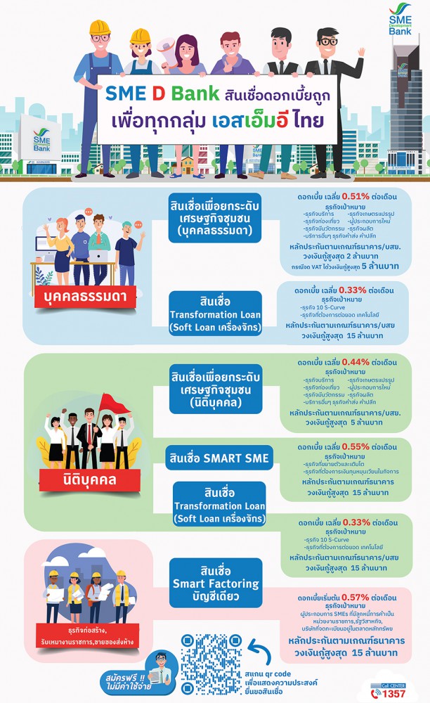 สำหรับกลุ่มนิติบุคคล นำไปเสริมสภาพคล่อง เพิ่มเงินทุนหมุนเวียน ขยายธุรกิจ อัตราดอกเบี้ยเฉลี่ย 0.44% ต่อเดือน วงเงินกู้สูงสุด 5 ล้านบาท หรือปรับปรุงโรงงานให้ทันสมัย คิดอัตราดอกเบี้ยเฉลี่ย 0.33%ต่อเดือน วงเงินกู้สูงสุด 15 ล้านบาท