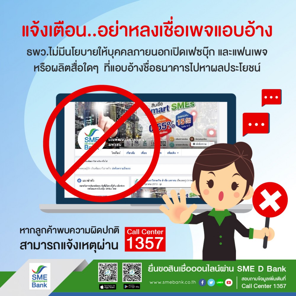 ทาง ธพว. ขอเรียนแจ้งเตือนผู้ประกอบการ เอสเอ็มอี ทุกท่านว่า Facebook Fanpage ดังกล่าว ไม่มีความเกี่ยวข้องใดๆ กับ ธพว. ทั้งสิ้น และ ธพว. ไม่มีนโยบายให้บุคคลภายนอกเปิด Facebook Fanpage หรือผลิตสื่อใดๆ เพื่อแอบอ้างชื่อธนาคารไปหาผลประโยชน์ ขณะนี้ ธพว. กำลังดำเนินการเอาผิดทางกฎหมาย เพื่อไม่ให้เป็นเยี่ยงอย่าง