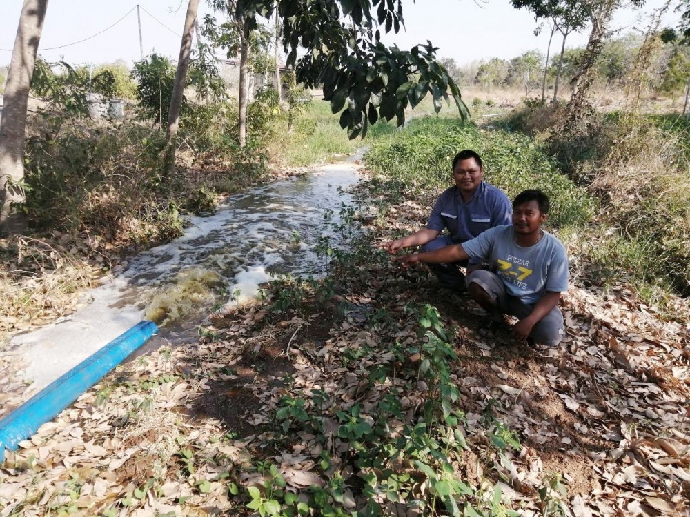 อำนาจ จงศุภวิศาลกิจ เกษตรกรในพื้นที่ ต.บ่อพลอย อ.บ่อพลอย จ.กาญจนบุรี เล่าว่า พื้นที่เพาะปลูกอ้อยและไร่ข้าวโพดอยู่ติดฟาร์มอุดมสุขของซีพีเอฟ ผมและเกษตรกรรายอื่นๆ มากกว่า 10 คน ที่ อาศัยรอบฟาร์ม ได้ขอปันน้ำจากฟาร์มมาใช้ในการเพาะปลูก รดน้ำในไร่อ้อยและไร่ข้าวโพด ซึ่งทางฟาร์มมีการจัดสรรรน้ำให้แก่เกษตรกรทุกรายอย่างทั่วถึง สลับกันคนละวัน โดยต่อท่อจากบ่อบำบัดน้ำของฟาร์มไปยังแปลงเกษตรโดยตรง และต่อท่อไปยังบ่อพักน้ำของเกษตรกร ช่วยลดต้นทุนค่าน้ำและค่าปุ๋ยได้เป็นอย่างมาก จากเดิมที่เคยมีค่าใช้จ่ายค่าน้ำเดือนละ 2-3 พันบาท และต้องซื้อปุ๋ยปีละ 2-3 ตัน ปัจจุบันใช้แค่ปีละ 1 ตันเท่านั้น หลังจากที่ได้ปันน้ำปุ๋ยจากฟาร์มมาช่วย โดยเฉพาะสถานการณ์ภัยแล้งปีนี้ซึ่งมาเร็วและรุนแรงกว่าปีที่ผ่านๆมา พบว่าน้ำในบ่อบาดาลมีปริมาณลดลงจนเกือบแห้งบ่อ จึงต้องลดพื้นที่ปลูกอ้อยจากที่เคยปลูก 30 ไร่ เหลือเพียง 10 ไร่ เพื่อให้มีน้ำเพียงพอในการดูแล ฟาร์มสุกรปันน้ำมาให้เป็นการช่วยให้พืชที่เพาะปลูกไว้ไม่แห้งตาย