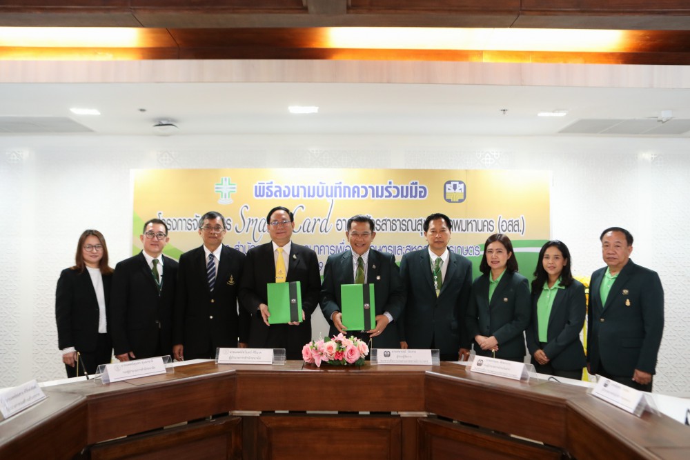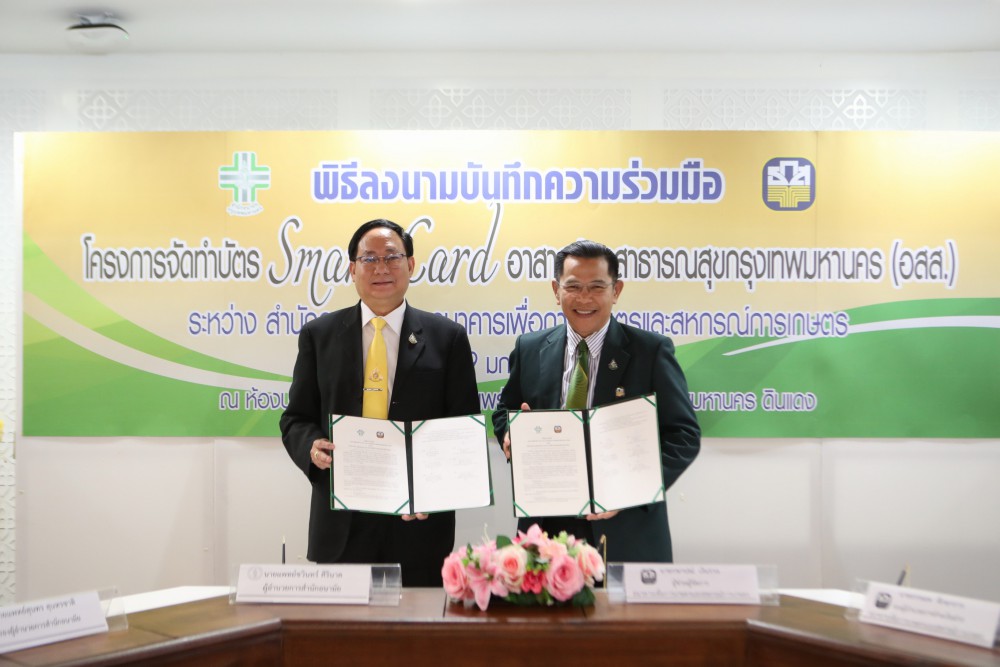 นายกษาปณ์ เงินรวง (ขวา) ผู้ช่วยผู้จัดการธนาคารเพื่อการเกษตรและสหกรณ์การเกษตร(ธ.ก.ส.) และนายแพทย์ชวินทร์ศิรินาค ผู้อำนวยการสำนักอนามัย กรุงเทพมหานคร ร่วมลงนามบันทึกความร่วมมือโครงการจัดทำบัตรSmart Card อาสาสมัครสาธารณสุขกรุงเทพมหานคร(อสส.) เพื่ออำนวยความสะดวกให้ อสส. สามารถใช้บัตร Smart Card อสส. แทนบัตรประจำตัว อสส.