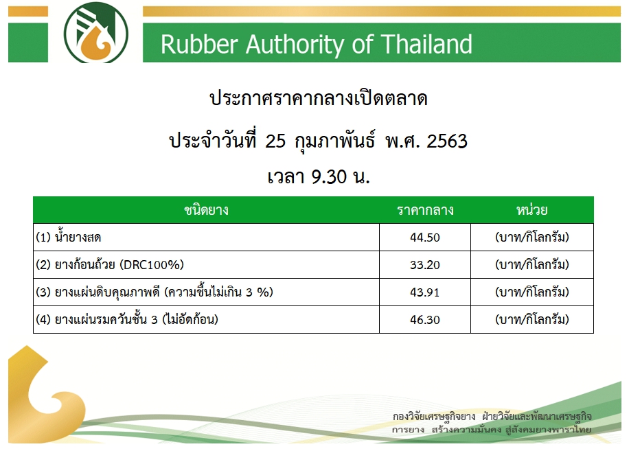 ราคากลางยางพาราเปิดตลาดวันนี้ (25 ก.พ.63)น้ำยางสด กก.ละ 44.50 บาท กุมภาพันธ์ 25, 2020กุมภาพันธ์ 25, 2020ดลมนัส กาเจราคายางพารา, สถานีข่าววันนี้ราคากลางยางพาราวันนี้, ราคายางพารา, ราคายางพาราวันนี้ ที่มา : ที่มาการยางแห่งประเทศไทย