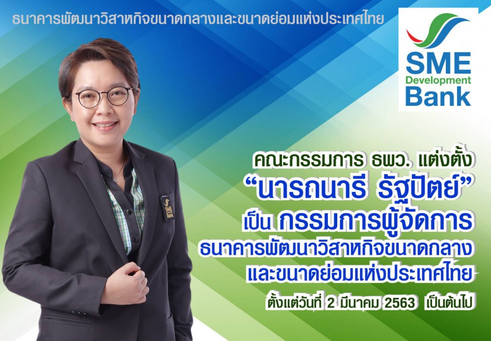 คณะกรรมการธนาคารพัฒนาวิสาหกิจขนาดกลางและขนาดย่อมแห่งประเทศไทย (ธพว.) มีมติอนุมัติแต่งตั้ง นางสาวนารถนารี รัฐปัตย์ เป็น “กรรมการผู้จัดการธนาคารพัฒนาวิสาหกิจขนาดกลางและขนาดย่อมแห่งประเทศไทย” และผ่านความเห็นชอบจากธนาคารแห่งประเทศไทย และกระทรวงการคลัง เป็นที่เรียบร้อยแล้ว มีผลตั้งแต่วันที่ 2 มีนาคม 2563 เป็นต้นไป