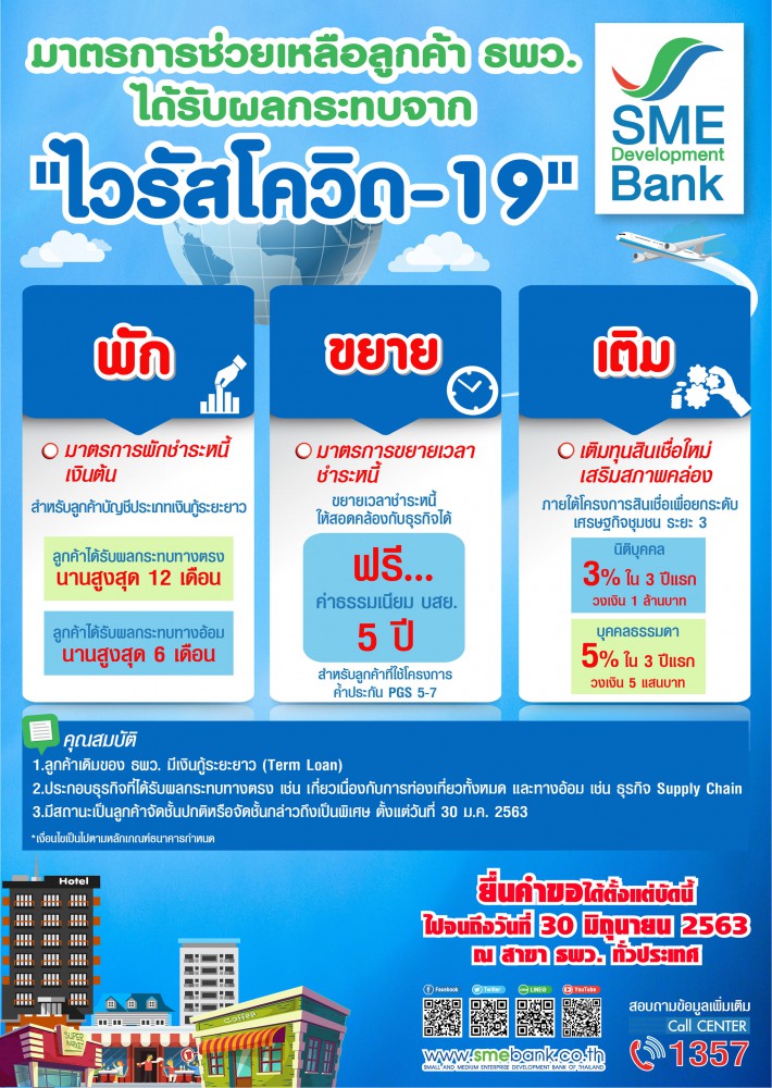 1.มาตรการ “พัก” ชำระหนี้เงินต้นสำหรับลูกค้าที่ได้รับผลกระทบทางตรง นานสูงสุด 12 เดือน และลูกค้าที่ได้รับผลกระทบทางอ้อม นานสูงสุด6 เดือน เพื่อช่วยลดภาระการชำระหนี้และมีสภาพคล่องเพิ่มขึ้น สามารถดำเนินธุรกิจต่อไปได้ โดยเริ่มพักชำระนับจากเดือนถัดไปที่ได้รับการอนุมัติพักชำระหนี้เงินต้น
