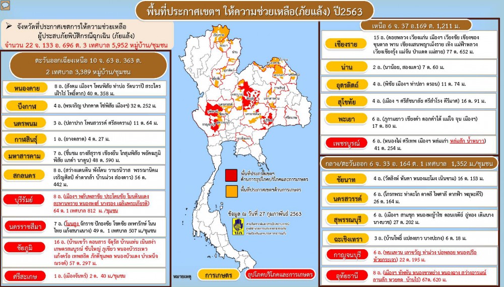 ดร. สมเกียรติ ประจำวงษ์ เลขาธิการสำนักงานทรัพยากรน้ำแห่งชาติ (สทนช.) ในฐานะรองผู้อำนวยการกองอำนวยการน้ำแห่งชาติ เปิดเผยภายหลังเป็นประธานการประชุมคณะทำงานภายใต้กองอำนวยการน้ำแห่งชาติ (กอนช.) ครั้งที่ 5/2563 ว่า ที่ประชุมได้มีการติดตามผลการสำรวจพื้นที่ประสบภัยแล้ง และการให้ความช่วยเหลือน้ำแล้ง ปี 2563 โดยกรมป้องกันและบรรเทาสาธารณภัย กระทรวงมหาดไทย ได้มีการดำเนินการสำรวจและวิเคราะห์พื้นที่เสี่ยงขาดแคลนน้ำอุปโภค-บริโภค พบพื้นที่ประกาศเขตฯ ให้ความช่วยเหลือภัยแล้ง จำนวน 22 จังหวัด โดยแบ่งเป็นพื้นที่ขาดแคลนน้ำเพื่อการอุปโภคบริโภค จำนวน 7 จังหวัด ได้แก่ จังหวัดบุรีรัมย์ นครราชสีมา ชัยภูมิ ศรีษะเกษ เพชรบูรณ์ กาญจนบุรี อุทัยธานี ขณะนี้มีหน่วยงานลงพื้นที่เพื่อเร่งแก้ไขปัญหาแล้ว