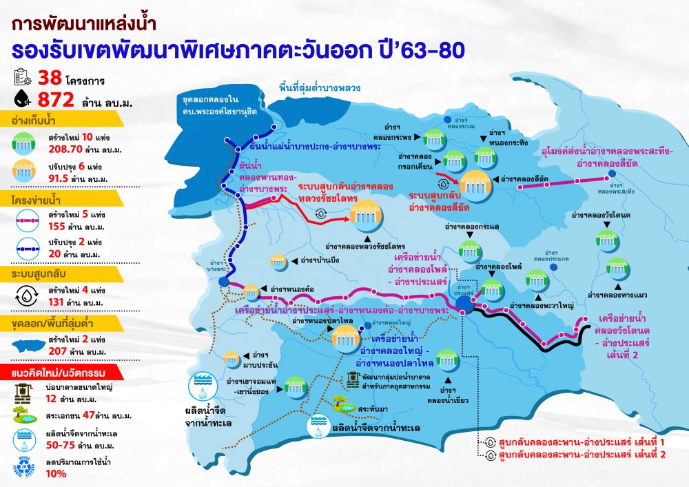 ขณะที่พื้นที่จังหวัดฉะเชิงเทรา ได้ใช้น้ำจากลุ่มน้ำเจ้าพระยาเข้ามาเสริมในระบบประปาฝั่งขวาของแม่น้ำบางปะกง ส่วนฝั่งซ้ายของแม่น้ำนั้นใช้น้ำจากอ่างคลองสียัดและอ่างคลองระบมเป็นหลัก ทั้งนี้ ในปีงบประมาณ พ.ศ. 2563 รัฐบาลได้อนุมัติงบกลางเพิ่มเติมในการดำเนินการวางระบบประปาหนองกลางดง-พัทยา จังหวัดชลบุรี ใช้เวลาในการดำเนินการ 120 วัน ประกอบกับ ทุกภาคส่วนได้ให้ความร่วมมือเป็นอย่างดีในการดำเนินงานต่าง ๆ โดยเฉพาะทางจังหวัด ซึ่งทำหน้าที่เป็นแกนกลางในการประสานงาน รวมไปถึงความร่วมมือในการลดการใช้น้ำของภาคอุตสาหกรรม ทำให้ทุกมาตรการดำเนินไปได้อย่างมีประสิทธิภาพ