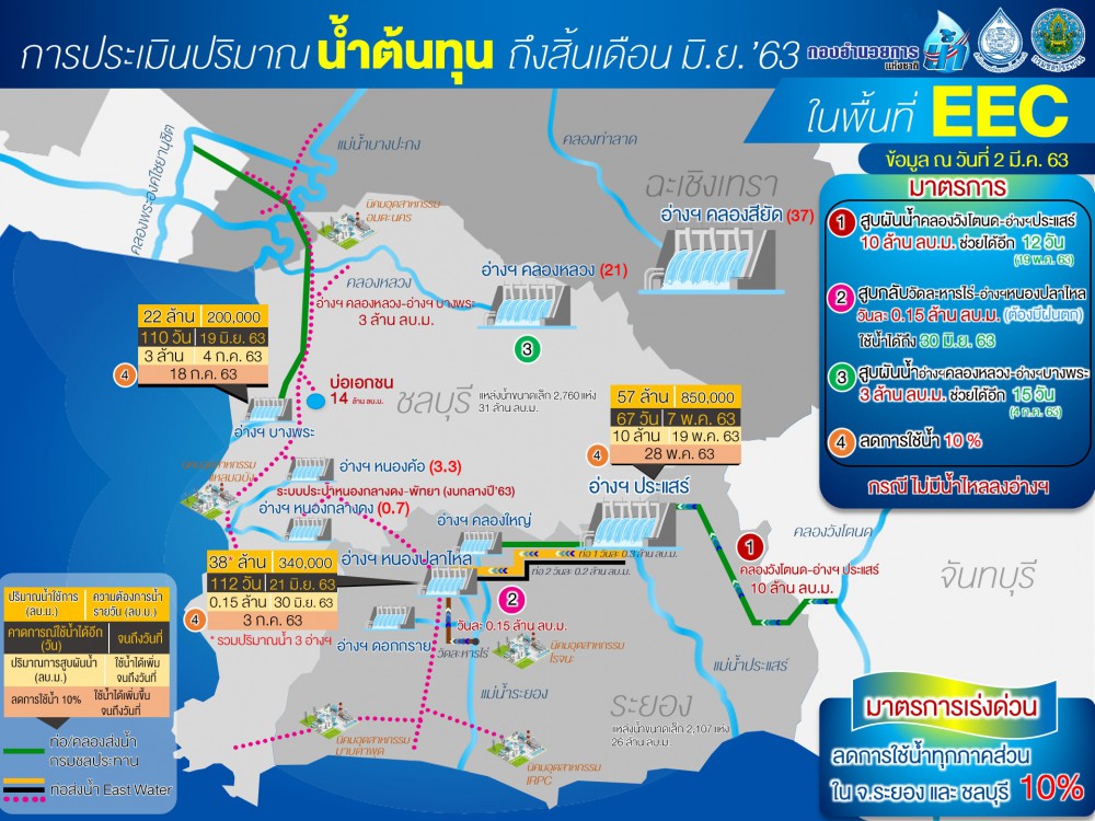 ในส่วนของพื้นที่จังหวัดชลบุรี ที่ปัจจุบันใช้น้ำจากอ่างเก็บน้ำบางพระ อ่างเก็บน้ำหนองค้อ และอ่างเก็บน้ำคลองหลวง รัชชโลทรฯ เพื่อให้ปริมาณน้ำในอ่างเก็บน้ำสามารถใช้ได้ถึงวันที่ 30 มิถุนายน 2563 เช่นเดียวกัน จึงต้องปรับลดการจ่ายน้ำให้กับบริษัทจัดการและพัฒนาทรัพยากรน้ำภาคตะวันออก จำกัด (มหาชน) หรือ อีสท์ วอเตอร์ ดังนั้น ที่ประชุมจึงได้ร่วมหารือกับกรมชลประทานและอีสท์ วอเตอร์ ถึงมาตรการในการเร่งหาแหล่งน้ำต้นทุนเพิ่มเติมจากแหล่งน้ำเอกชนอีก 14 ล้านลูกบาศก์เมตร เข้ามาในระบบเครือข่ายอ่างเก็บน้ำเพื่อทดแทนกับปริมาณน้ำที่ไม่สามารถสูบใช้ได้จากอ่างเก็บน้ำบางพระของกรมชลประทาน ขณะนี้อยู่ในระหว่างการดำเนินการเจรจากับเอกชนเจ้าของแหล่งน้ำดังกล่าว
