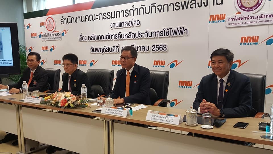 วันที่ 19 มีนาคม 2563 นายคมกฤช ตันตระวาณิชย์ เลขาธิการสำนักงานคณะกรรมกำกับกิจการพลังงาน ( กกพ.) ในฐานะโฆษก กกพ. เปิดเผยว่า ขณะนี้ประกาศหลักเกณฑ์คณะกรรมการกำกับกิจการพลังงาน (กกพ.) เรื่อง “การคืนหลักประกันการใช้ไฟฟ้าหรือค่าปรพกันมิเตอร์ไฟฟ้าให้แก่ผู้ใช้ไฟฟ้าประเภทที่ 1 บ้านอยู่อาศัย และประเภทที่ 2 กิจการขนาดเล็ก พ.ศ. 2563” จะมีผลบังคับใช้ในวันที่ 20 มีนาคม 2563 ส่งผลให้การไฟฟ้าฝ่ายจำหน่าย ซึ่งได้แก่ การไฟฟ้านครหลวง (กฟน.) การไฟฟ้าส่วนภูมิภาค (กฟภ.) และกิจการไฟฟ้าสวัสดิการกองทัพเรือ (กฟส.) จะต้องคืนเงินประกันการใช้ไฟฟ้าสำหรับผู้ใช้ไฟฟ้าดังกล่าวกว่า 23 ล้านรายทั่วประเทศ วงเงินกว่า 33,000 ล้านบาท โดยผู้ใช้ไฟฟ้าต้องแจ้งความประสงค์ขอรับคืน และให้ผู้บริการไฟฟ้าคืนหลักประกันการใช้ไฟฟ้า ตั้งแต่วันที่ 31 มีนาคม 2563 ซึ่งต้องคืนให้กับผู้ใช้ไฟฟ้าที่วางหลักประกันตามประเภทของขนาดเครื่องวัดหน่วยไฟฟ้า และจะไม่มีการเรียกเก็บเงินหลักประกันการใช้ไฟฟ้าจากผู้ใช้ไฟฟ้ารายใหม่อีกต่อไป ยกเว้นกรณีเปลี่ยนประเภทผู้ใช้ไฟฟ้าจากประเภทที่ 1 และผู้ใช้ไฟฟ้าประเภทที่ 2 ไปเป็นผู้ใช้ไฟฟ้าประเภทอื่น