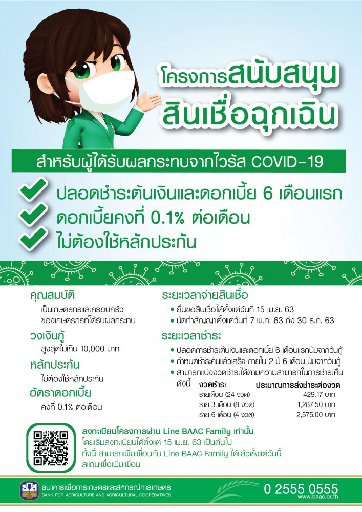 ธ.ก.ส. อัดงบฯสินเชื่อฉุกเฉิน 2 หมื่นล้านบาท ช่วยเหลือผู้ที่ได้รับผลกระทบจากการแพร่ระบาดของเชื้อไวรัสโควิด-19 สนับสนุนสินเชื่อฉุกเฉินเพื่อเป็นค่าใช้จ่ายสำหรับผู้ได้รับผลกระทบ ในอัตราดอกเบี้ยคงที่ร้อยละ 0.1 ต่อเดือน รายละไม่เกิน 10,000 บาท ชำระคืนไม่เกิน 2 ปี 6 เดือนไม่ต้องใช้หลักประกันปลอดชำระคืนต้นเงินและดอกเบี้ยใน 6 เดือนแรกเปิด รับลงทะเบียนออนไลน์ 15 เมษายนนี้ ผ่านทาง LINE BAAC Family