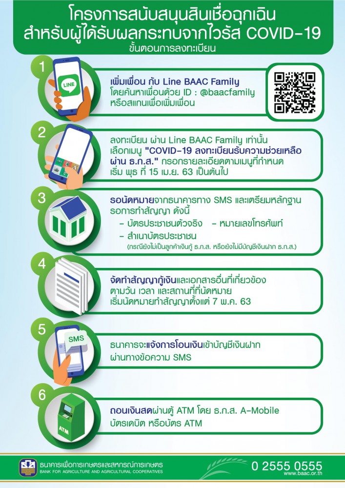 ทั้งนี้ ธนาคารเปิดรับลงทะเบียนเข้าร่วมโครงการฯ ผ่านช่องทาง LINE BAAC Family โดยสามารถเพิ่มเพื่อนด้วยการสแกนQR Code หรือค้นหาเพื่อนด้วย ID : @baacfamilyได้ตั้งแต่บัดนี้เป็นต้นไปและเริ่มลงทะเบียนพร้อมกันในวันที่ 15 เมษายน 2563 เป็นต้นไป และเมื่อเข้าสู่การลงทะเบียนตามช่องทางข้างต้นแล้ว กดเลือกเมนู “COVID-19” และกรอกรายละเอียดตามเมนูที่กำหนดโดยรอรับนัดหมายจากธนาคารทาง SMS พร้อมเตรียมหลักฐานบัตรประชาชน สำเนาบัตรประชาชน กรณียังไม่ได้เป็นลูกค้า ธ.ก.ส. มาก่อน เบอร์โทรศัพท์มือถือของตนเองและข้อมูลบุคคลอื่นที่ติดต่อแทนได้เมื่อนัดหมายทำสัญญาและผ่านขั้นตอนการพิจารณาอนุมัติสินเชื่อแล้ว ธนาคารจะส่ง SMS แจ้งผลกรณีอนุมัติจะโอนเงินเข้าบัญชีเงินฝากโดยตรงภายใน 1วัน และท่านสามารถถอนเงินสดผ่านตู้ ATM โดยใช้บัตร ATM บัตรเดบิต หรือบริการกดเงินไม่ใช้บัตรผ่านแอปพลิเคชัน ธ.ก.ส. A-Mobile