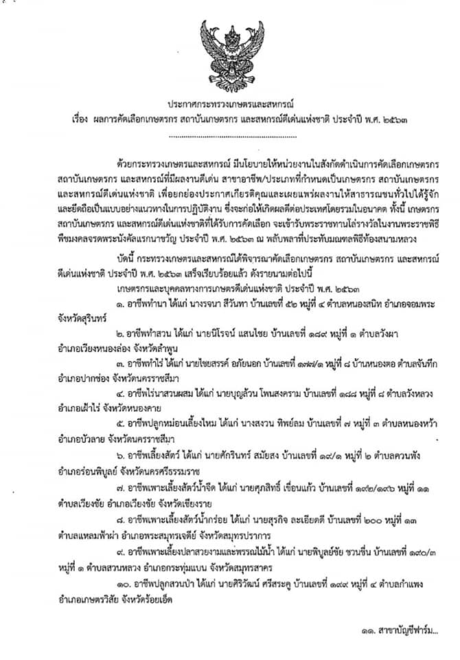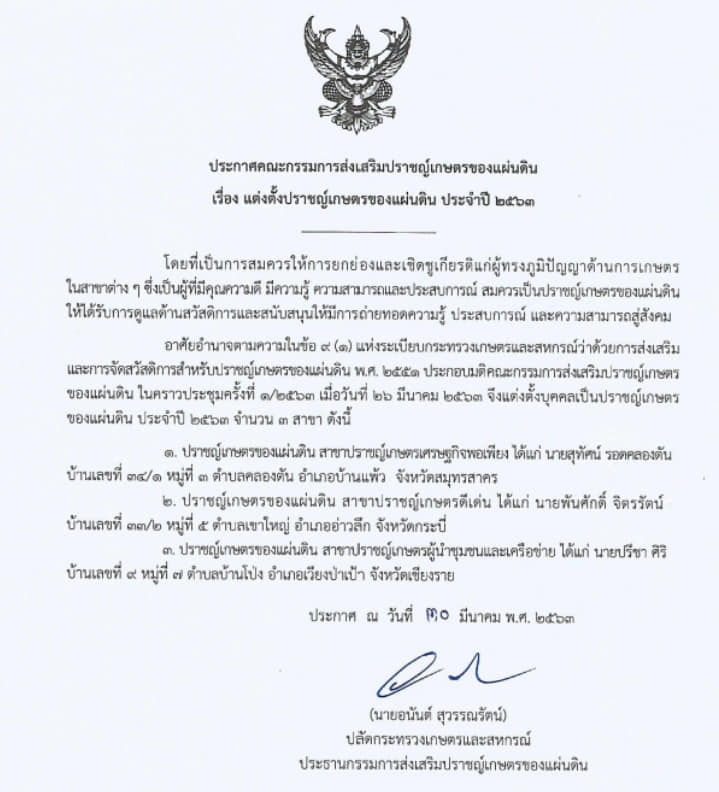 กระทรวงเกษตรและสหกรณ์ ได้ทำการตัดเลือกและเปิดตัวเกษตรกร สถาบันเกษตรกร สหกรณ์ดีเด่นแห่งชาติ และปราชญ์เกษตรของแผ่นดินเป็นเรียบร้อยแล้ว เพื่อเตรียมเข้ารับพระราชทานโล่รางวัลในงานพระราชพิธีพืชมงคลจรดพระนังคัลแรกนาขวัญ ประจำปี พ.ศ. 2563 (กรณีสถานการณ์การระบาดของเชื้อไวรัสโควิด-19 สู่ภาวะปกติ)ลงนามโดยนายอนันต์ สุวรรณรัตน์ ปลัดกระทรวงเกษตรและสหกรณ์ เมื่อวันที่ 3 เมษายน 2563 ที่ผ่านมาตรวจดูรายละเอียดได้