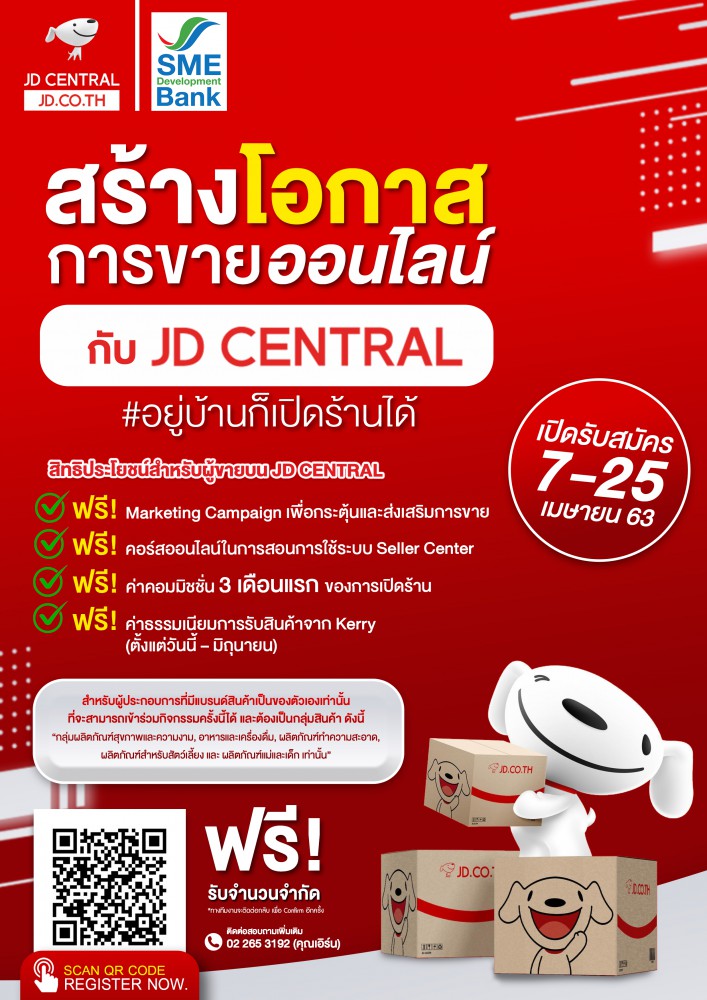 ธนาคารพัฒนาวิสาหกิจขนาดกลางและขนาดย่อมแห่งประเทศไทย(ธพว.) หรือ SME D Bank ร่วมมือกับE-commerce ชื่อดังอย่าง “เจดีเซ็นทรัล” จัดโครงการ “สร้างโอกาสด้วยธุรกิจ Online กับ JD CENTRAL” เพื่อประกาศหาผู้ประกอบการในธุรกิจอาหาร ,ธุรกิจสุขภาพและความงาม , ธุรกิจสัตว์เลี้ยง และธุรกิจสินค้าแม่และเด็ก ที่มีสินค้าดี คุณภาพเด่น พาก้าวขึ้นสู่ Platform Online JD CENTRAL ที่มีผู้ใช้งานกว่า 5 ล้านคน และมีแนวโน้มที่จะเพิ่มขึ้นอย่างต่อเนื่อง ถือเป็นโอกาสของผู้ประกอบการ SMEs ในประเทศไทยที่ต้องการจะขยายตลาดในช่วงนี้ เพื่อจะกลับมาแข่งขันในตลาดได้อีกครั้ง โดยทาง JD CENTRAL ใจดีมอบแคมเปญสุดพิเศษฟรี! ค่าคอมมิชชั่น 3 เดือน