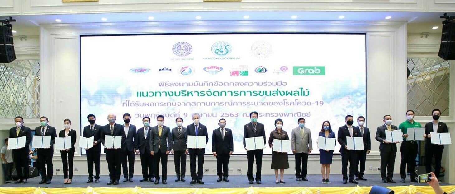 วันที่ 9 เมษายน 2563 ได้มีพิธีการลงนามข้อตกลง (MOU)ว่าด้วยบริหารจัดการการขนส่งผลไม้ ช่วง COVID ระหว่างหน่วยงานภาครัฐกับเอกชน โดยภาครัฐประกอบด้วยกรมส่งเสริมการเกษตร กรมส่งเสริมสหกรณ์ กรมการค้าภายใน กรมส่งเสริมการค้าระหว่างประเทศ ส่วนภาคเอก ประกอบด้วยสมาพันธ์ผู้ให้บริการโลจิสติกส์ไทย สมาคมขนส่ง สินค้าและโลจิสติกส์ไทย สมาคมการค้าธุรกิจบริการและผลิตภัณฑ์ผสมผสาน สมาคมผู้ค้าและส่งออกผลไม้ไทย สมาคมผู้ประกอบการผักผลไม้ไทย และบริษัท ไทยฟินเทค จํากัด ณ กรมส่งเสริมการเกษตร เพื่อร่วมบูรณาการผลักดันการดําเนินงานขนส่งสินค้าผลไม้ เพื่อลดผลกระทบที่อาจส่งผลต่อเศรษฐกิจโดยรวมของประเทศ ทั้งเกษตรกร ผู้ประกอบการต่างๆ รวมถึงผลผลิตกับสินค้าเกษตร