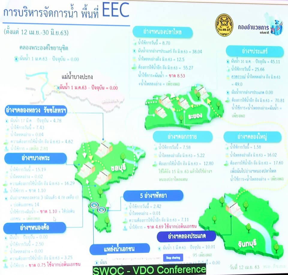 ขณะเดียวกัน ยังได้หารือถึงแผนบริหารจัดการน้ำในภาวะวิกฤติในส่วนภาคตะวันออก ซึ่งนายกรัฐมนตรีมีความเป็นห่วงและติดตามสถานการณ์อย่างใกล้ชิด โดยล่าสุดพบว่า หน่วยงานต่าง ๆ ที่เกี่ยวข้องทั้งภาครัฐ เอกชน ได้ประสานความร่วมมือเร่งรัดดำเนินการเชื่อมโยงเครือข่ายน้ำตามมติที่ประชุมกองอำนวยการน้ำแห่งชาติ ที่ได้มีการกำหนดมาตรการรับมือล่วงหน้า เพื่อเพิ่มปริมาณน้ำในอ่างเก็บน้ำหนองปลาไหล และอ่างเก็บน้ำคลองใหญ่ที่ประสบปัญหาน้ำในอ่างฯ น้อย ซึ่งจะช่วยทำให้สถานการณ์น้ำจังหวัดระยองและ EEC ดีขึ้น แต่เพื่อความไม่ประมาทได้เน้นย้ำให้กรมชลประทานและบริษัทอีสวอเตอร์ การประปาภูมิภาค ประเมินปริมาณน้ำต้นทุน พร้อมเตรียมมาตราการจัดหาแหล่งน้ำสำรองเพิ่มขึ้นด้วย รองรับภาวะเสี่ยงขาดแคลน้ำกรณีไม่มีฝนตกถึงเดือน มิ.ย.63 โดยเร็ว รวมถึงให้การนิคมอุตสาหกรรมเป็นเจ้าภาพหลักในติดตามการใช้น้ำภาคอุตสาหกรรม โดยให้หน่วยงานที่เกี่ยวข้องรายงานผลการปฏิบัติงานทุกวันพุธให้กองอำนวยการน้ำแห่งชาติ เพื่อใช้ในการติดตามการบริหารจัดการน้ำ