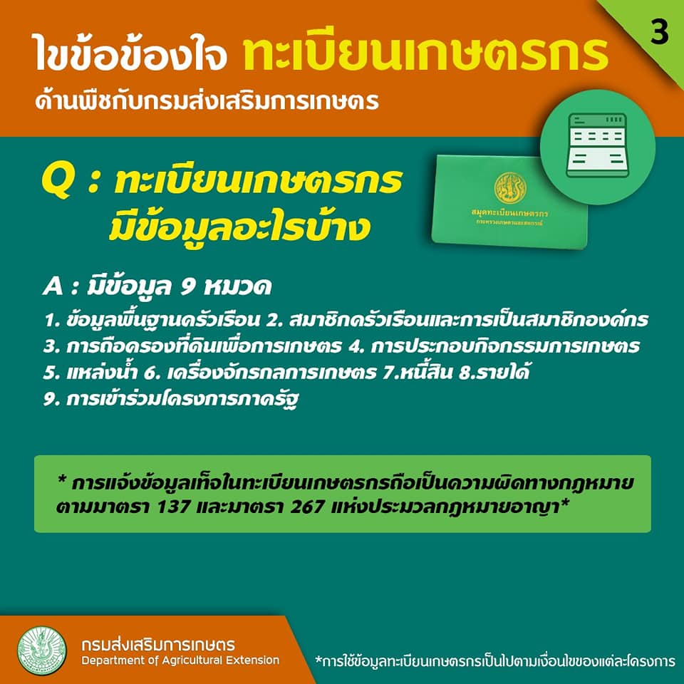 * การแจ้งข้อมูลเท็จในทะเบียนเกษตรกร ถือเป็นความผิดทางอาญา ตามมาตรา 137 และ มาตรา 267 แห่งประมวลกฎหมายอาญา