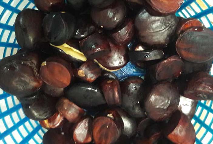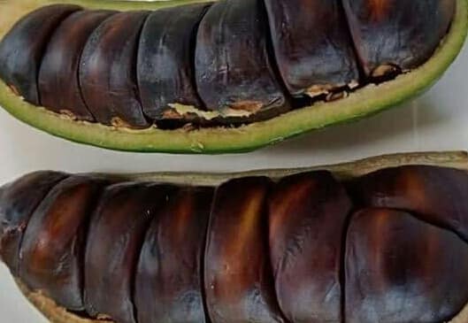 ผล เป็นฝักกลมยาวทรงกระบอก เปลือกอุ้มน้ำมี กาบแข็งหุ้ม มีเส้นผ่าศูนย์กลาง 1.5-2.5 ซม.ยาว 8-13 ซม. เยื่อหุ้มสีเหลือง ด้านในมีเมล็ดผิวเปลือกเรียบ เมล็ดขนาดกลางเรียงซ้อนอัดแน่น 6-10 เมล็ด ทรงกระบอกเรียงซ้อนกันแน่น 6-10 เมล็ด พอแก่สีดำ