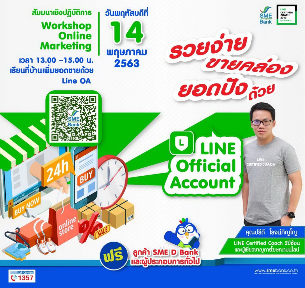 โดยวิทยากร คุณปรีดี โรจน์ภิญโญ Line Certified Coach 2 ปีซ้อน และผู้เชี่ยวชาญการโฆษณาบน Line จะมาแนะนำพร้อม Workshop การใช้งาน LINE OA เช่น สิ่งที่ต้องเรียนรู้ ฟีเจอร์ใหม่ และบริการทั้งหมดของ LINE OA รวมถึงสมัครใช้งานได้ทันที เป็นต้น พบการเวิร์คช้อปออนไลน์ได้ในวันพฤหัสบดีที่ 14 พฤษภาคม 2563 เวลา 13.00-15.00 น. ผู้สนใจลงทะเบียนร่วมเวิร์คช็อปออนไลน์ได้ฟรี เพียงสแกน QR Line ในโปสเตอร์ประชาสัมพันธ์ ด่วนจำนวนจำกัด สอบถามเพิ่มเติม โทร.1357